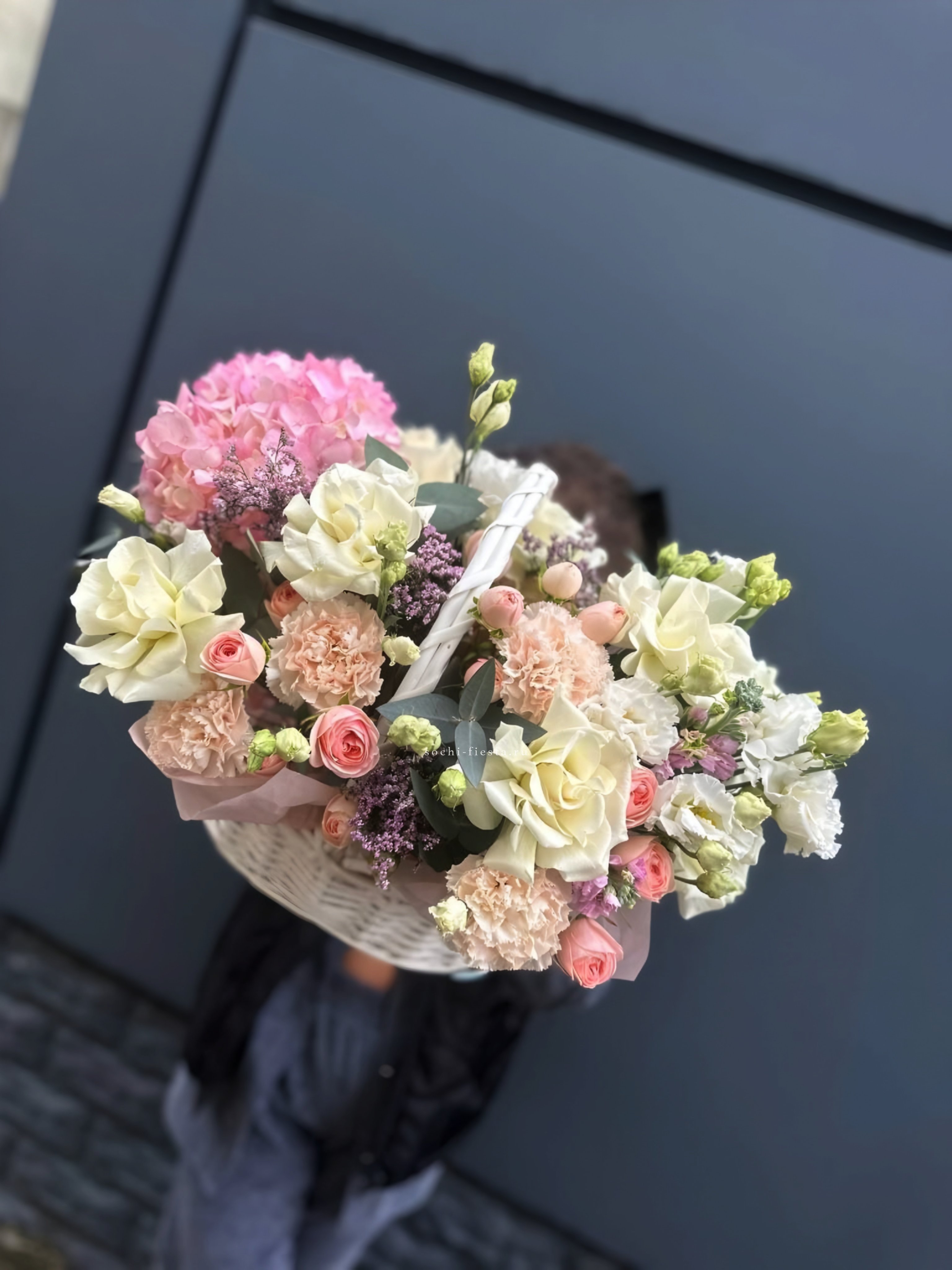Белые розы и эустома образуют воздушную композицию с мягкими переходами между соцветиями. Хризантемы и маттиола добавляют объема, а гипсофила создает легкую дымку по краям. Корзина выглядит свежо и собранно в любом пространстве.
