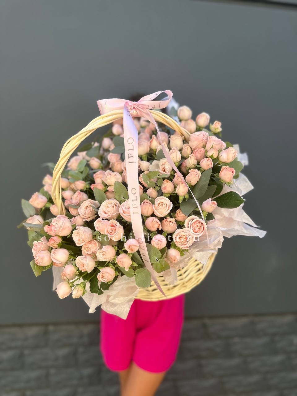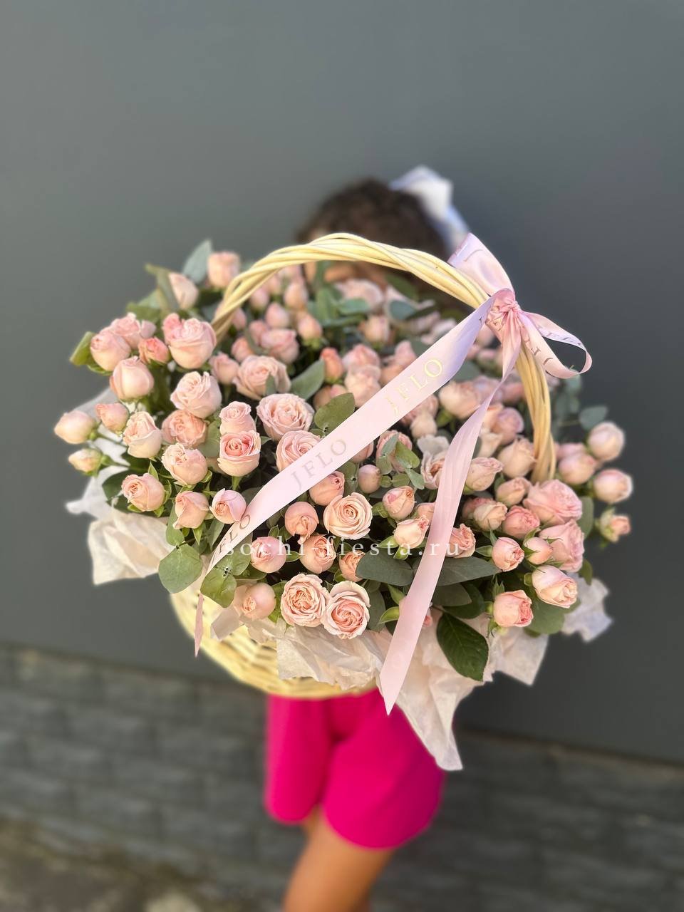 Шестьдесят одна голландская гербера собрана в плетёной корзине и создаёт яркое цветовое пятно высотой сорок сантиметров. Плотная россыпь соцветий держит форму и радует взгляд несколько дней подряд. Композиция не требует вазы и сразу готова к размещению в любом интерьере.