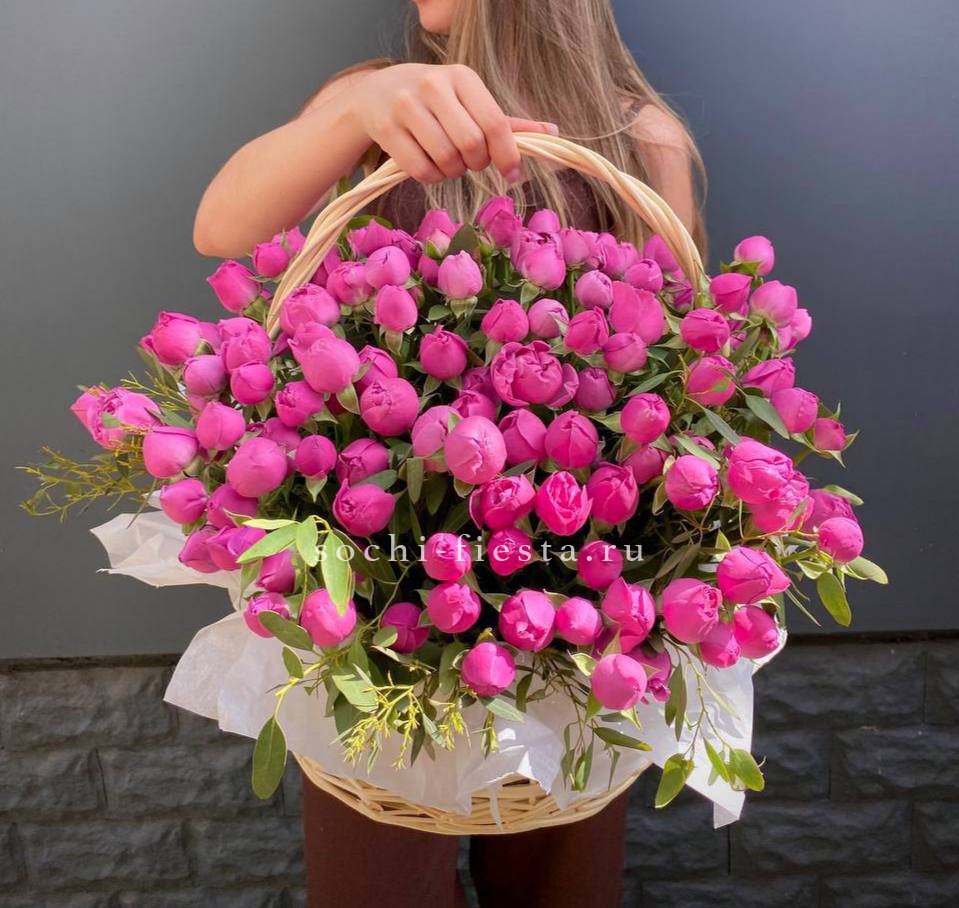 роза одноголовая, эустома, гортензия, мисти баблс, диантус, декоративная зелень, корзина D20. Итоговая корзинка может иметь композиционные отличия в зависимости от сезонности компонентов. При этом внешний вид, объем, цена компонентов, а также цветовая гамма композиции будут соответствовать оригиналу.