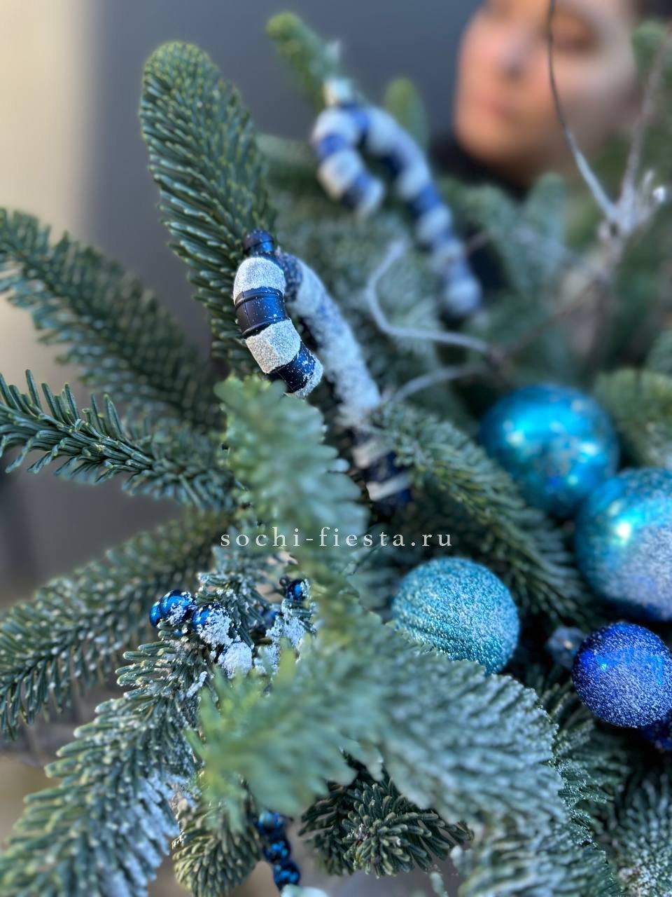 Ветви датского нобилиса плотно уложены в коробку и дополнены яркими игрушками. Компактная композиция удобна для размещения на полке или рабочем столе и сохраняет свежесть долгое время.
