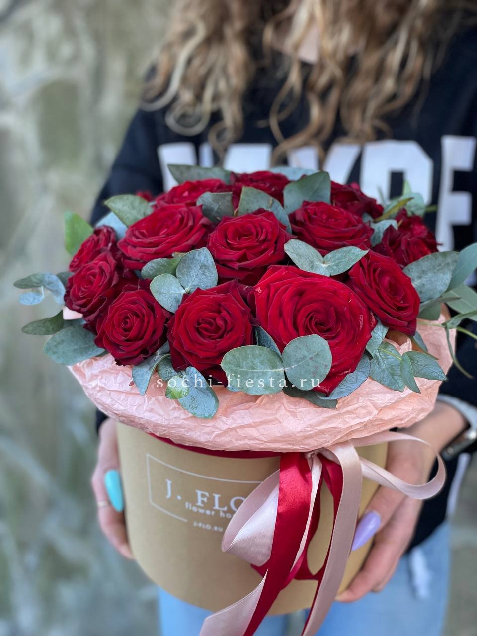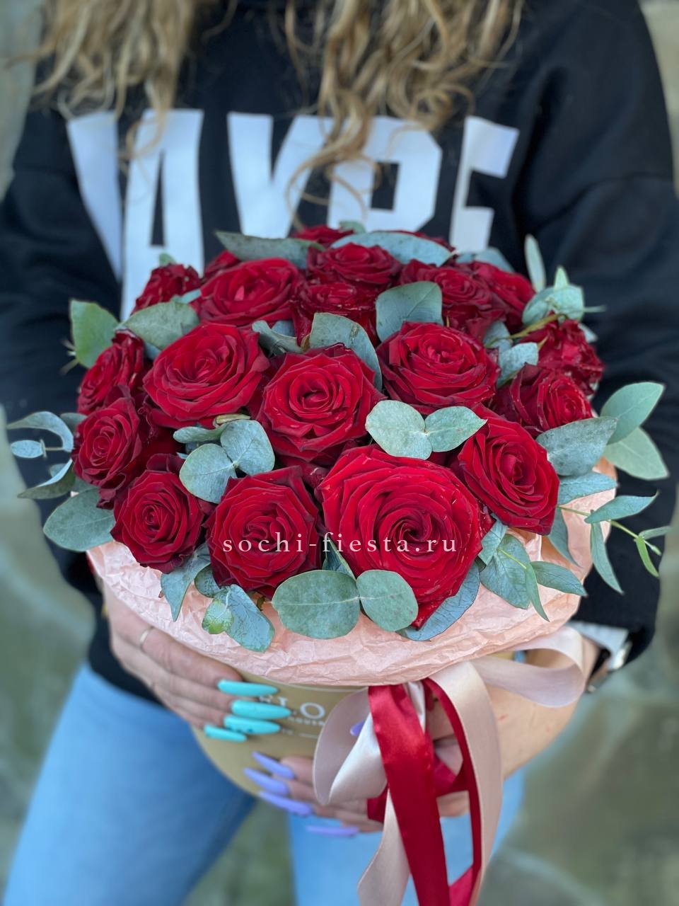 красная роза, эвкалипт, лента, цилиндр D16.
