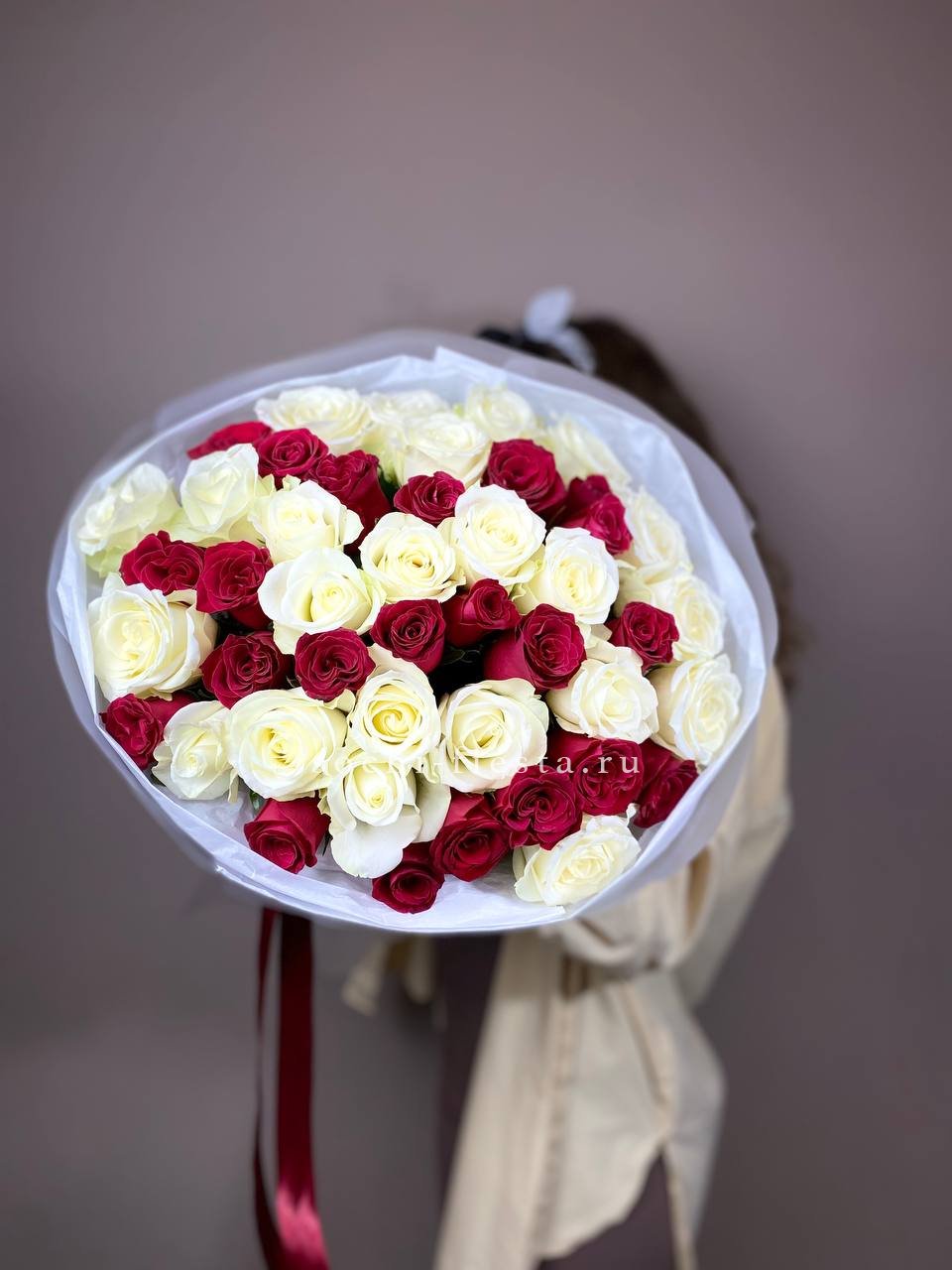 В составе 45 красно-белых роз.