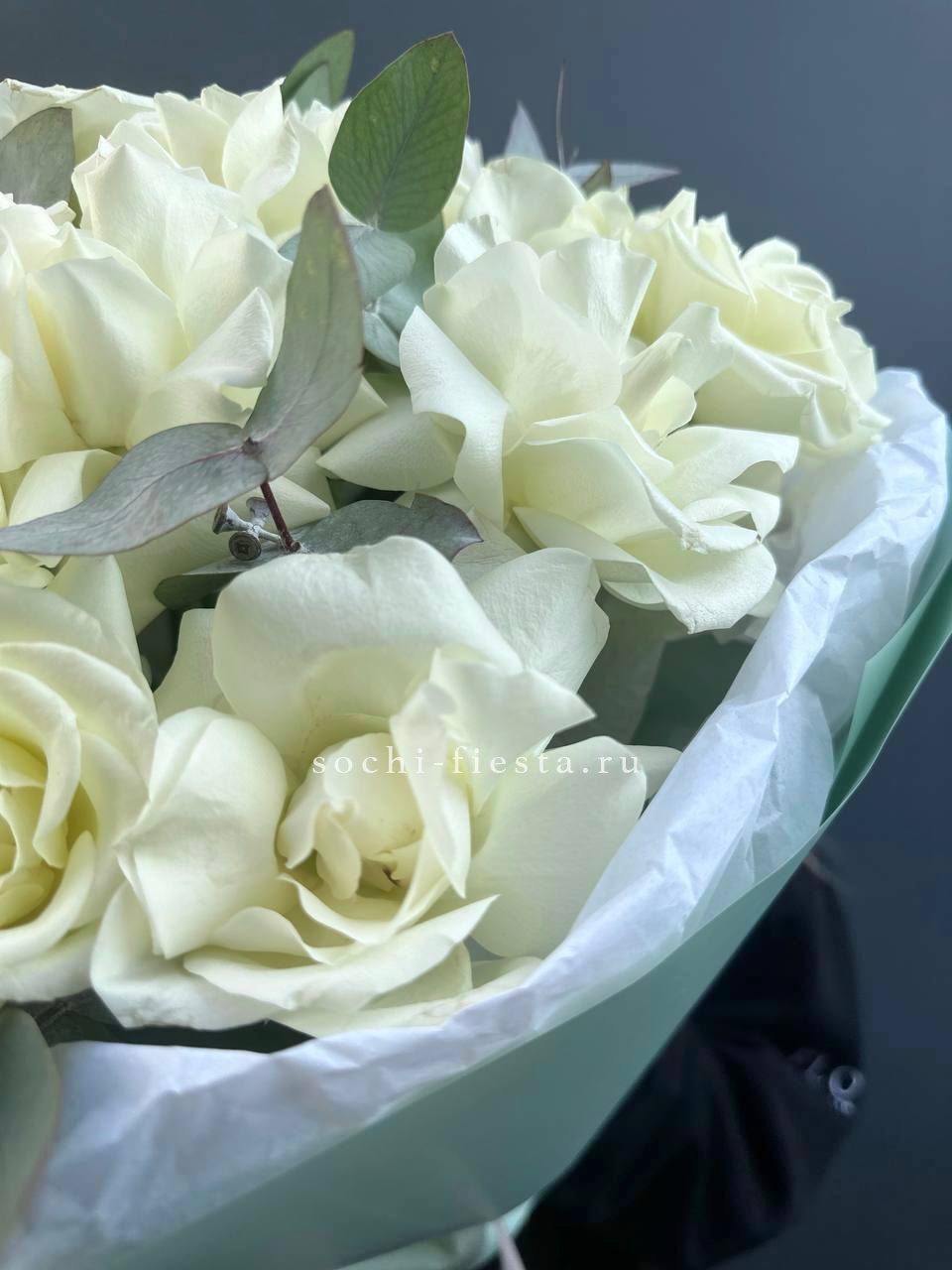Вывернутые лепестки французских роз Notte Bianca раскрываются широко и создают объемную текстуру. Двадцать пять бутонов в окружении эвкалипта выглядят современно и графично.
