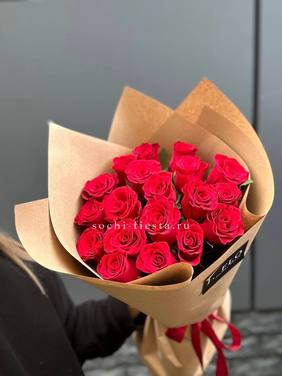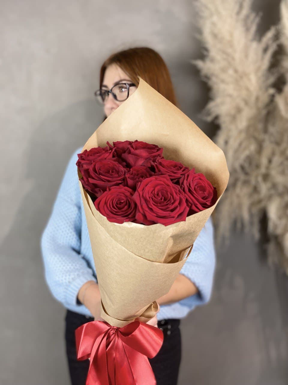 Классическая девятка в натуральной крафтовой упаковке. Бутоны с бархатистыми лепестками собраны в аккуратную композицию, которая легко размещается в любом пространстве.