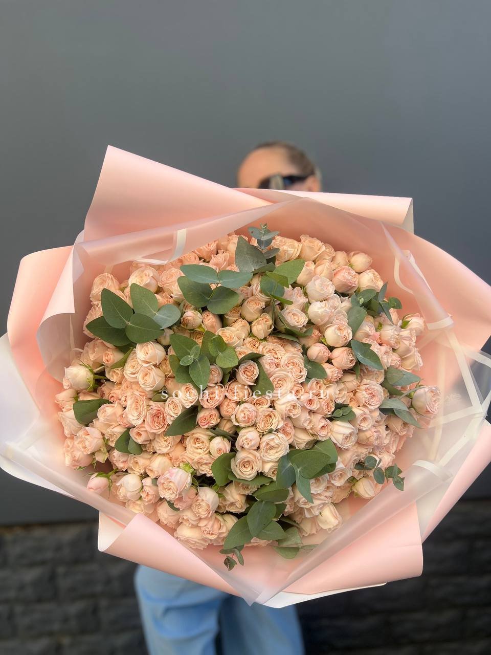 Сто одна кремовая кустовая роза дополнена ветками эвкалипта, который добавляет серебристые нотки и графичность линий. Крупная композиция притягивает внимание своим масштабом и спокойной цветовой гаммой.