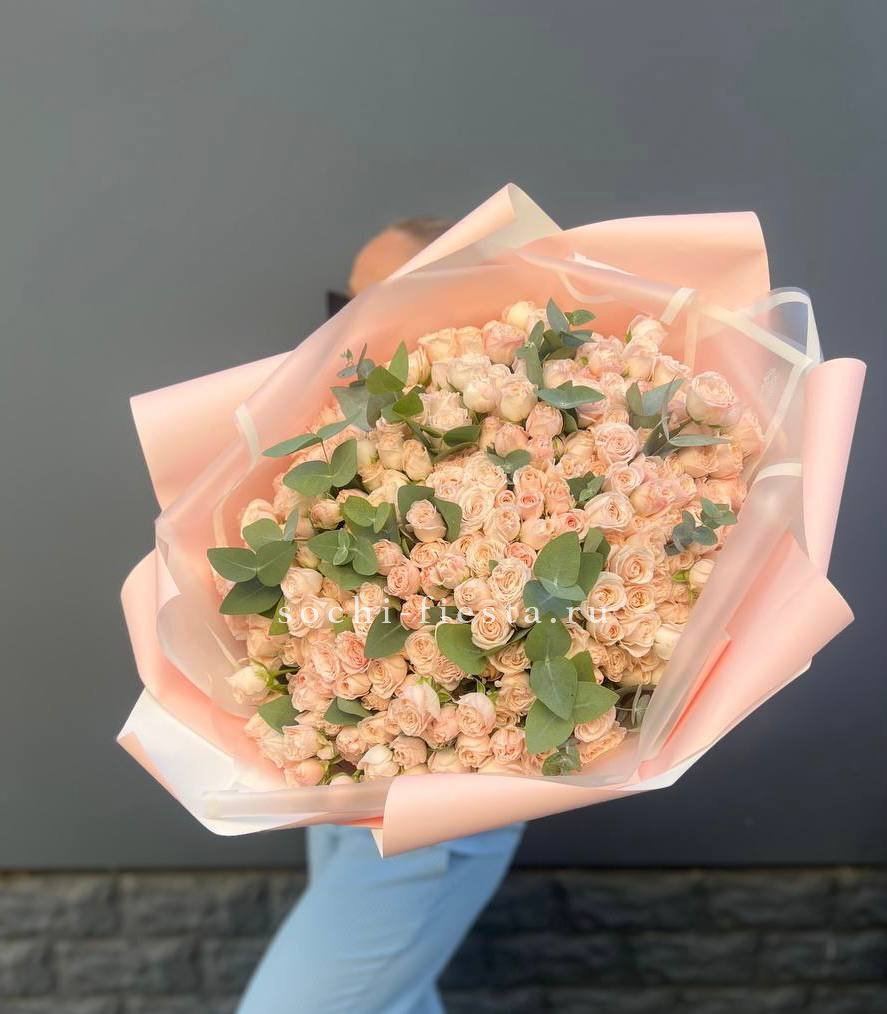 101 кремовая кустовая роза, эвкалипт, лента, дизайнерская упаковка.