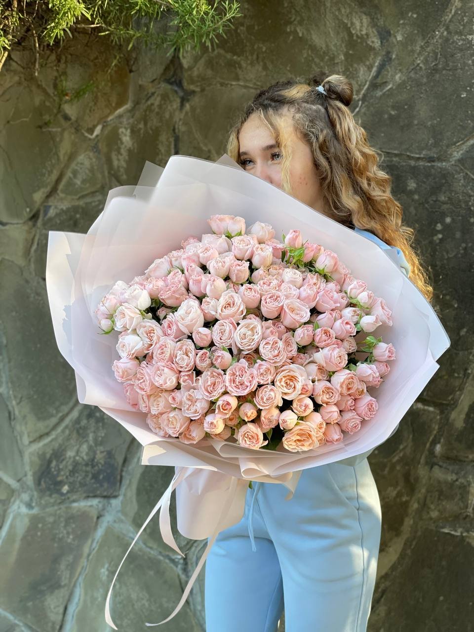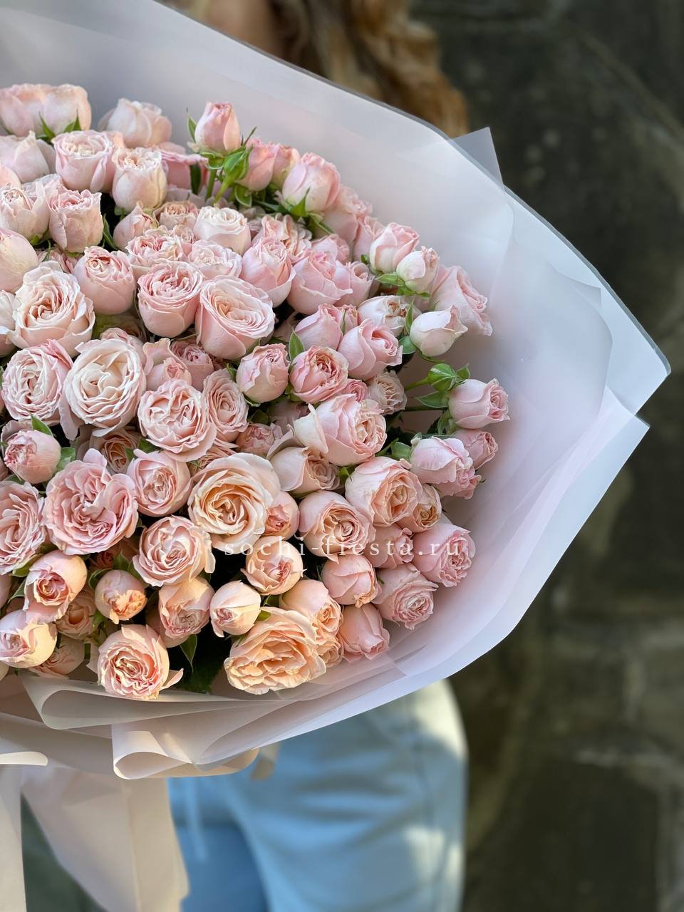 пионовидные розы сорта Бомбастик - 201 шт., дизайнерское оформление По желанию заказчика, композицию можно оформить в корзину.