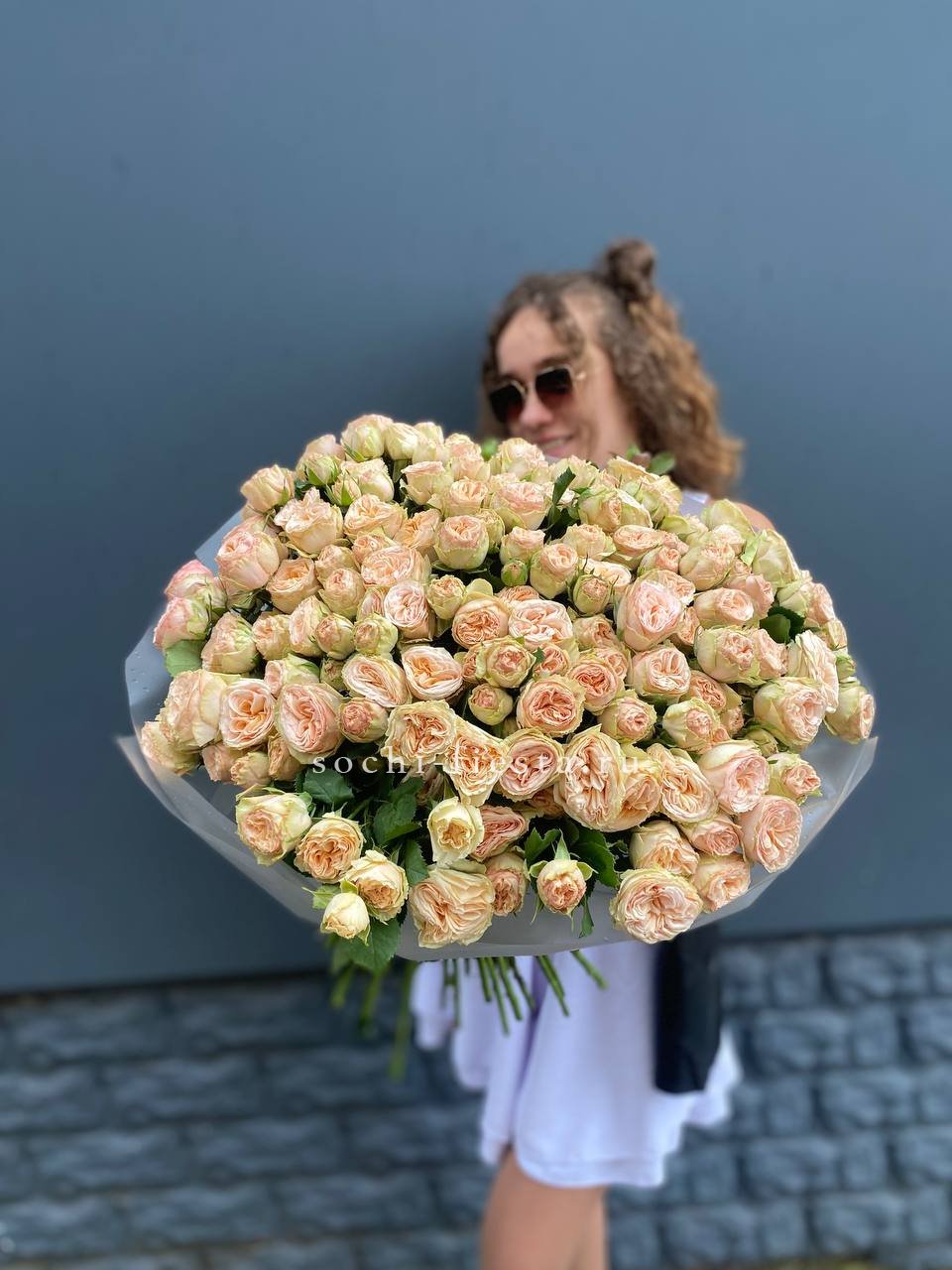 кустовая пионовидная роза, лента, дизайнерская упаковка.
