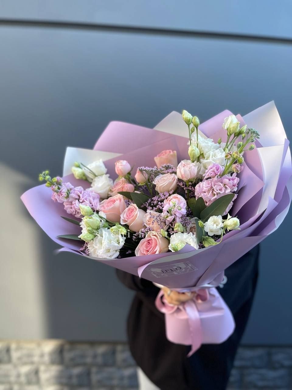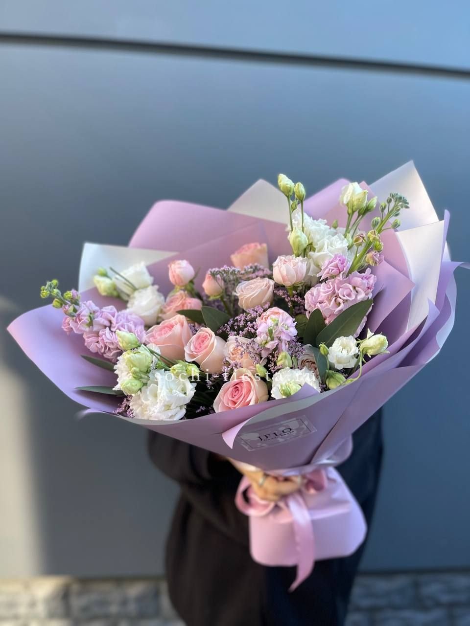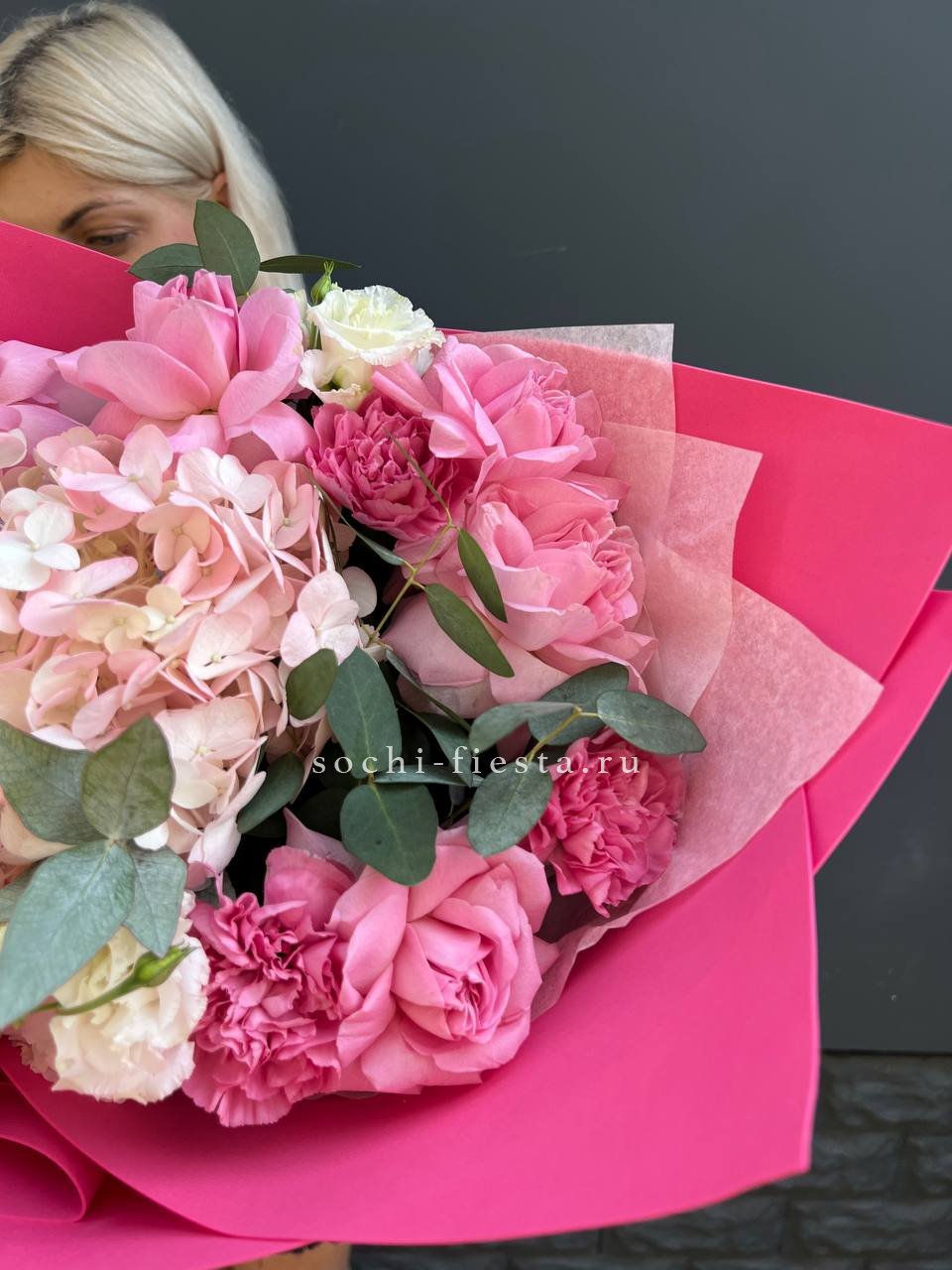 гортензия, розовые розы, диантусы, эустома, маттиолы, эвкалипт лента и дизайнерская пленка.