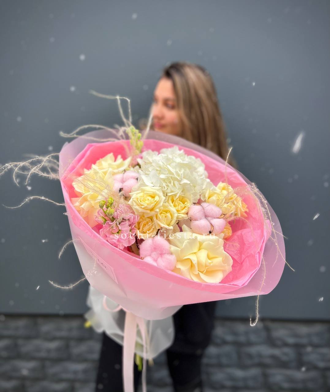 Белые французские розы переплетаются с пушистыми соцветиями маттиолы и хлопка. Гортензия и пионовидные бутоны создают объём, а ковыль вносит лёгкую небрежность в общий ритм.