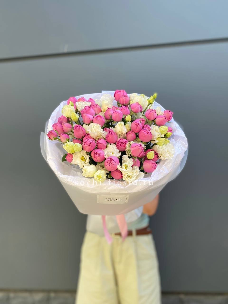 Кустовые розы и эустомы собраны в компактную форму с мягкими линиями. Сочетание нескольких оттенков создаёт живописный эффект без лишней пышности.