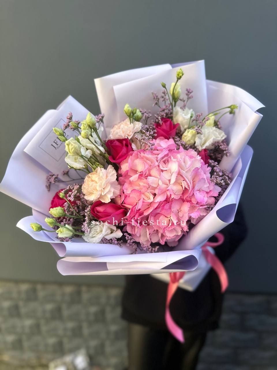 Белоснежные розы и пышные шапки гортензии сплетаются в плотную композицию, где эвкалипт задаёт спокойный ритм. Букет хорошо держит форму и долго сохраняет свежесть в вазе.