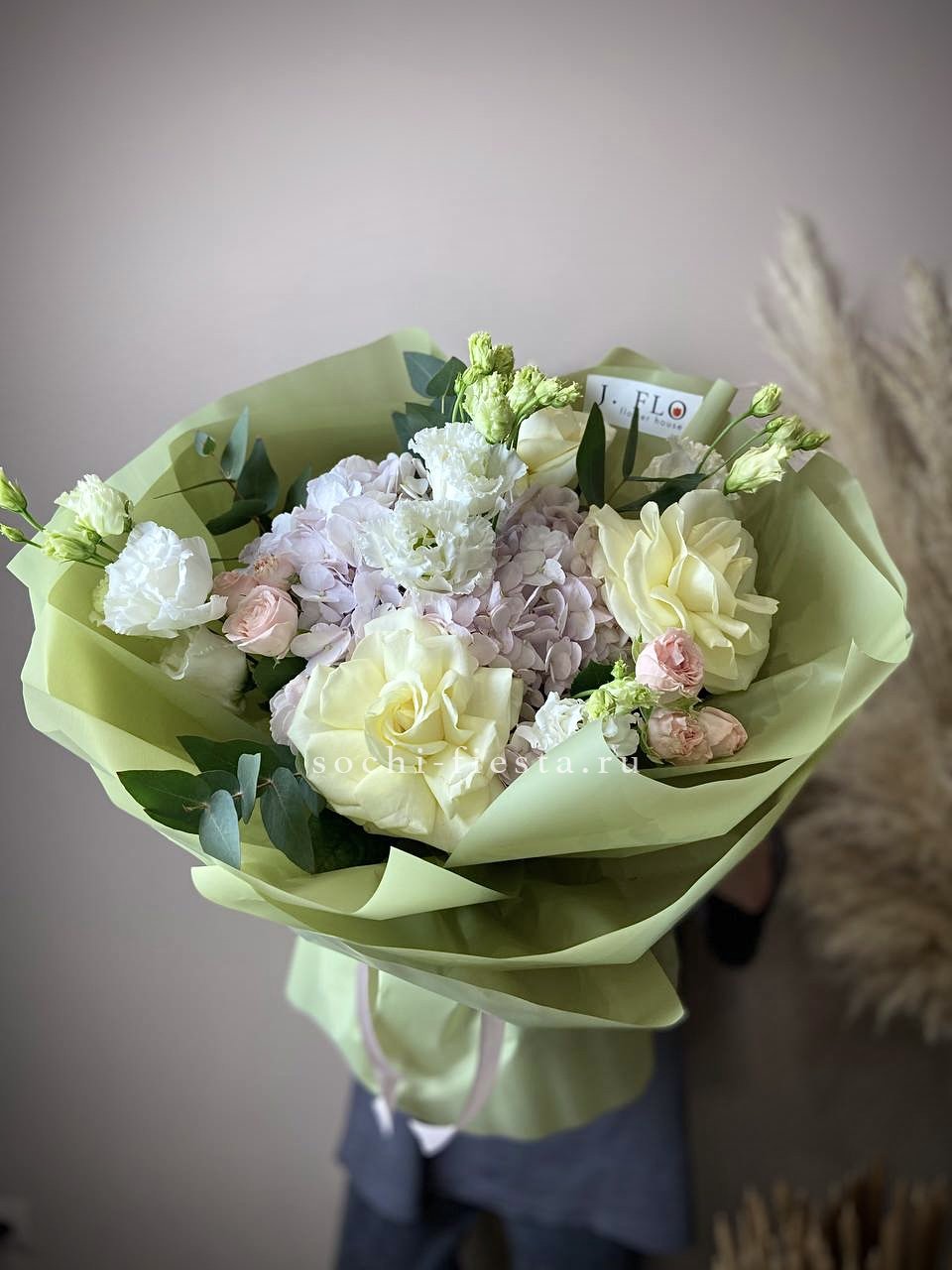 орхидея, гортензия, эустома астра, хризантема, хлопок, эвкалипт, лента, дизайнерская пленка.