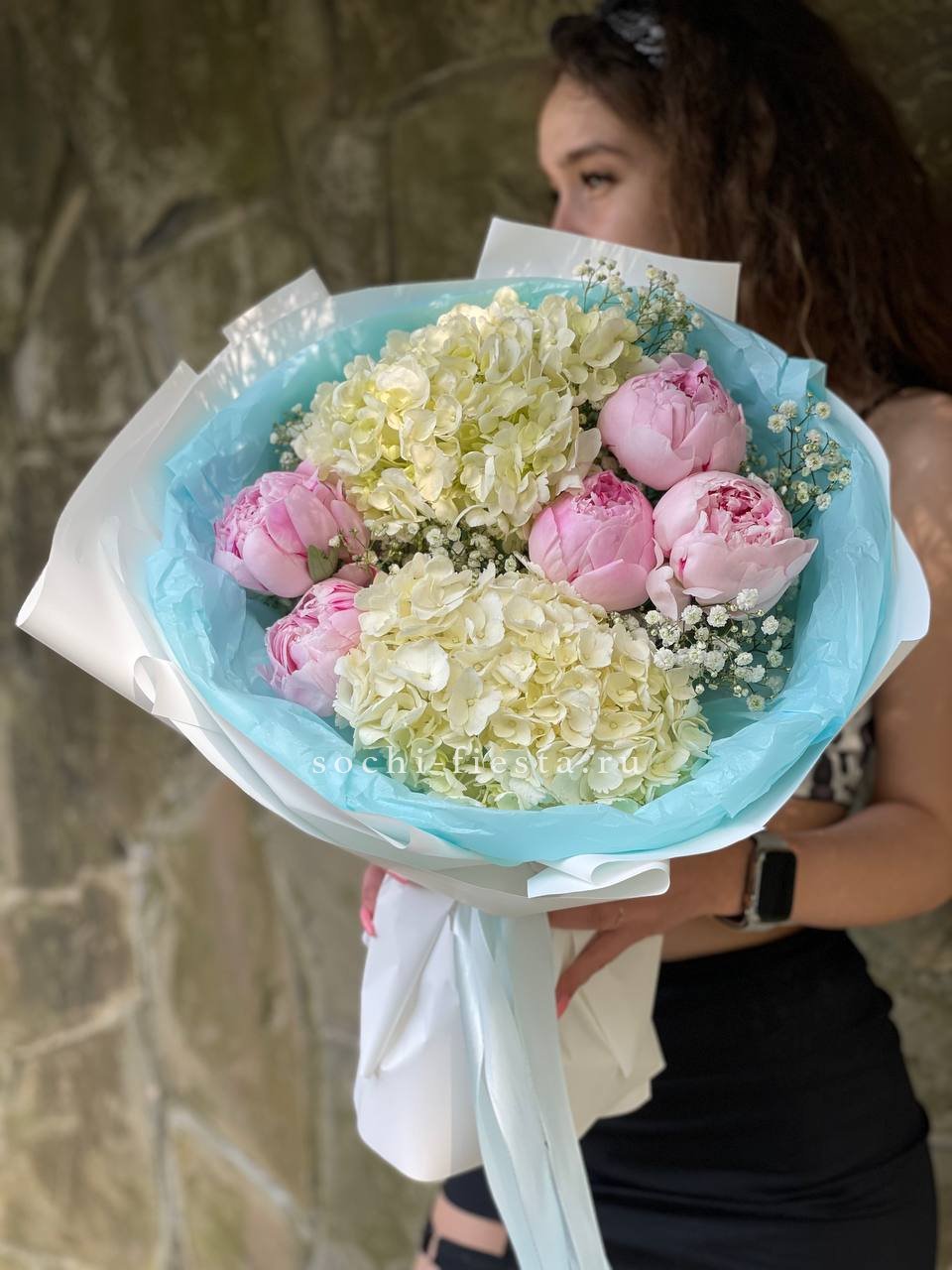 гортензия, розовые пионы Сара Бернар, гипсофила (аналог вне сезона по согласованию) лента, дизайнерская упаковка.
