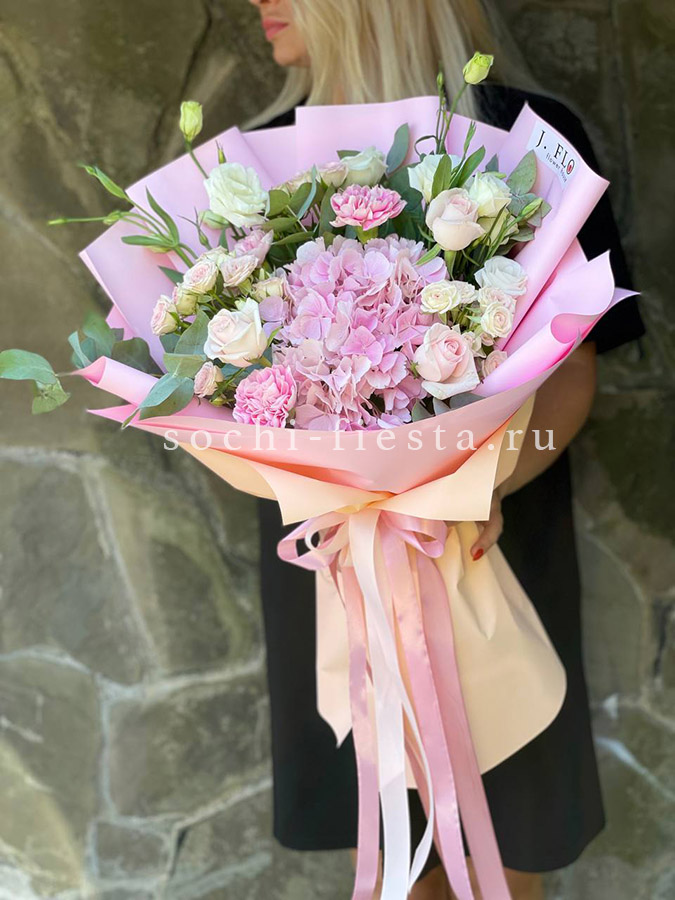 гербера, роза, хлопок, гортензия, диантус, эвкалипт, упаковка.