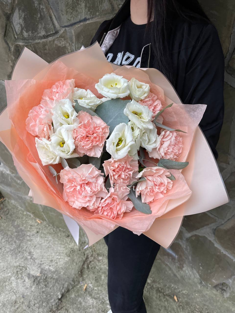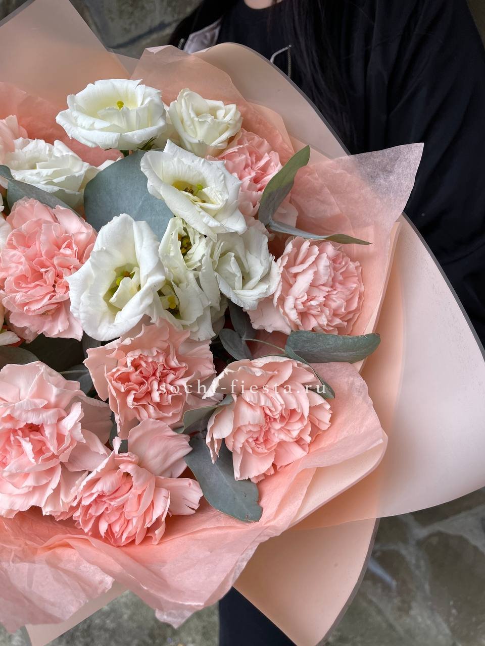 пионы (или аналог вне сезона), лимониум, маттиола, мисти баблс, эустома, эвкалипт, лента, упаковка.