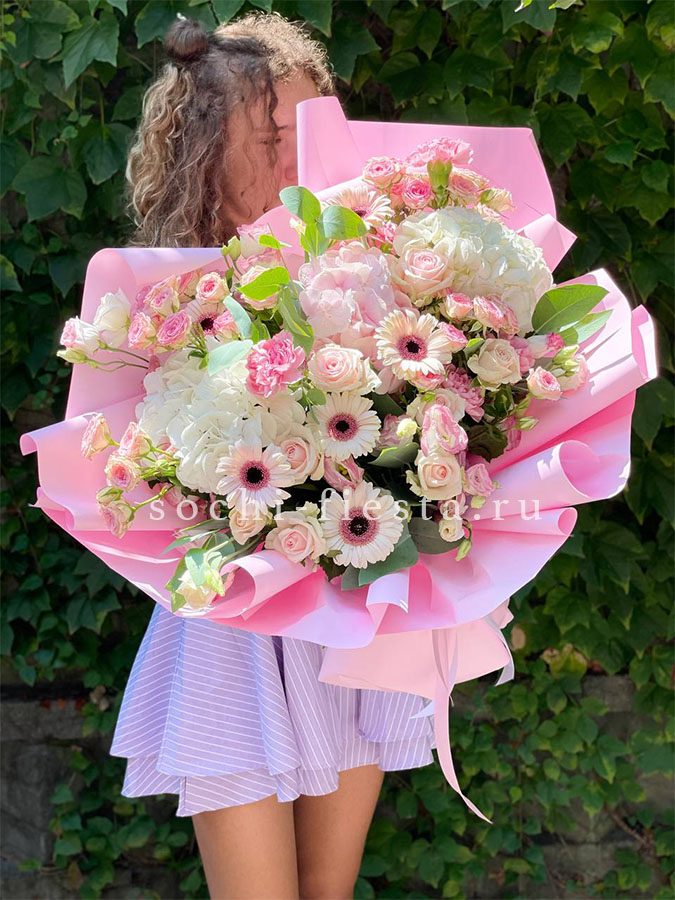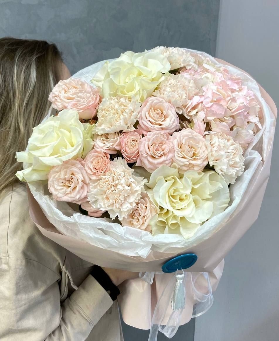 Пышная шапка из гортензии и пионовидных роз собрана с филигранной точностью. Диантус и эустома создают воздушные переходы между крупными соцветиями, а озотамнус добавляет графичные вертикали. Букет для тех, кто понимает язык авторской флористики.