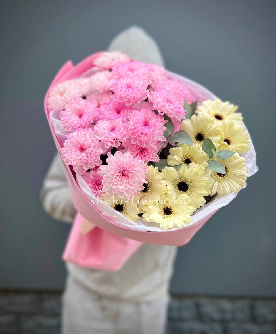 Солнечные герберы встречаются с пушистыми шапками хризантем в динамичной композиции. Веточки эвкалипта обрамляют цветы мягким зелёным контуром и придают свежесть.