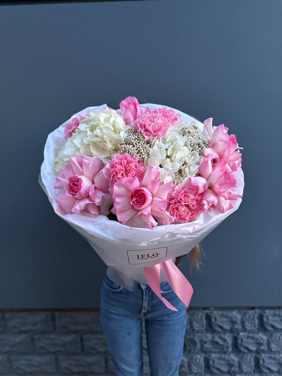 гортензия, пионовидная кустовая роза Мисти Баблс, лента, дизайнерская упаковка.