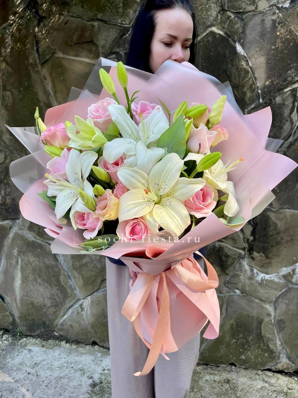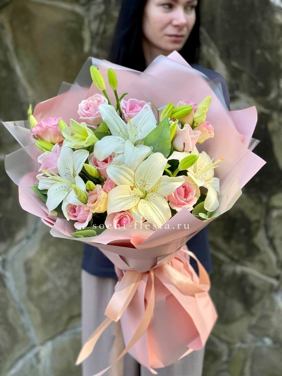 Лилии раскрываются постепенно, эустома добавляет объёма, а розовые розы задают тёплый тон всей композиции.