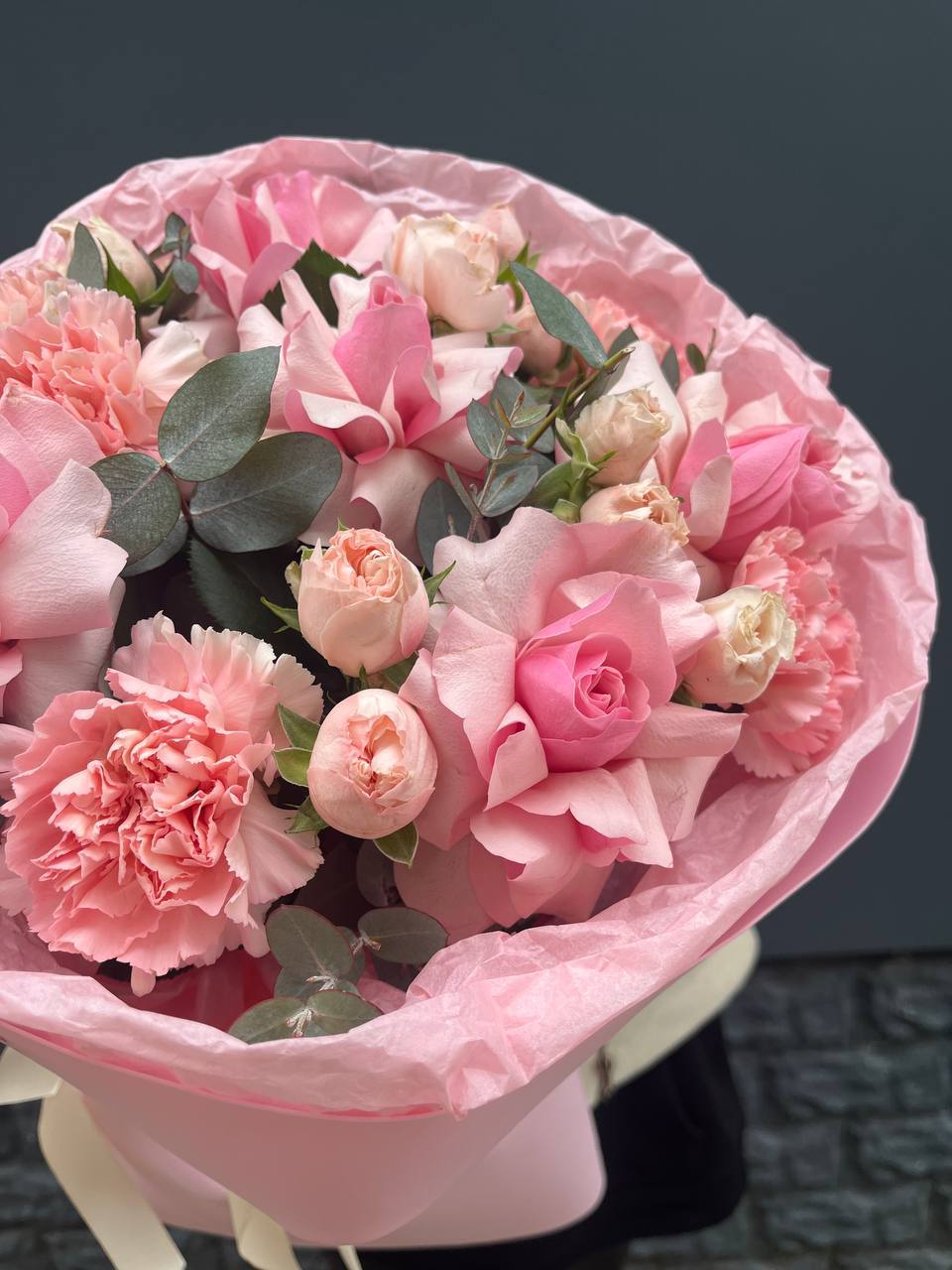Диантусы и кустовые розы создают воздушную композицию с мягкими переходами оттенков. Бутоны распределены свободно, образуя естественный силуэт без жесткой геометрии. Букет хорошо держит форму и долго сохраняет свежесть.