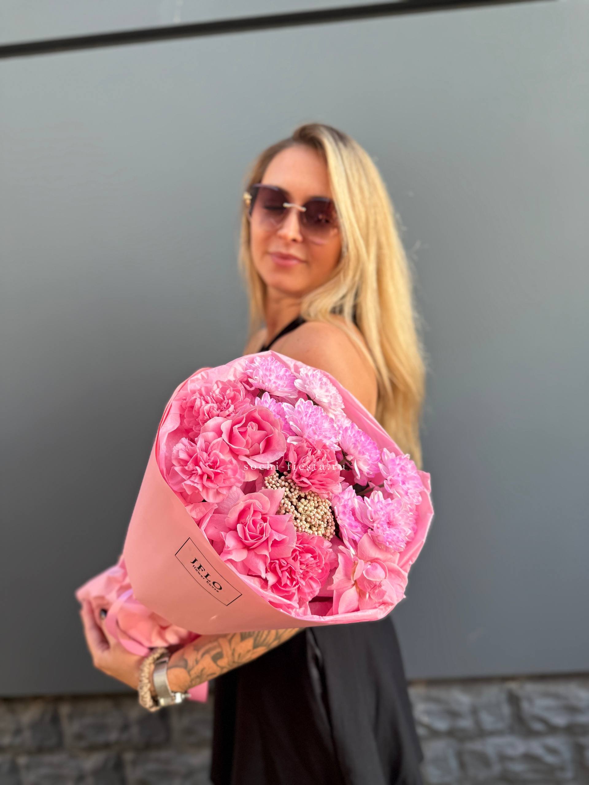 диантусы, розы, эустома, гортензия, эвкалипт, вспомогательные цветы, лента, корейская пленка.