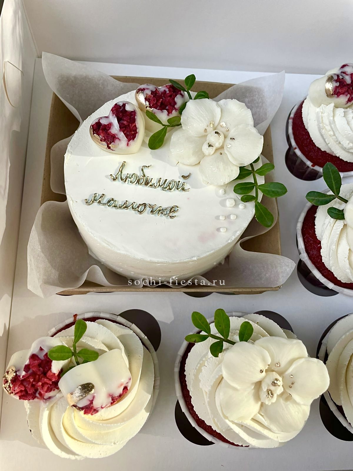 Набор из пяти капкейков и бенто-торта с декором из бельгийского шоколада и сушеных ягод. Четыре варианта начинок от красного бархата до ванили с ягодами. Фисташковая зелень добавляет свежести композиции.